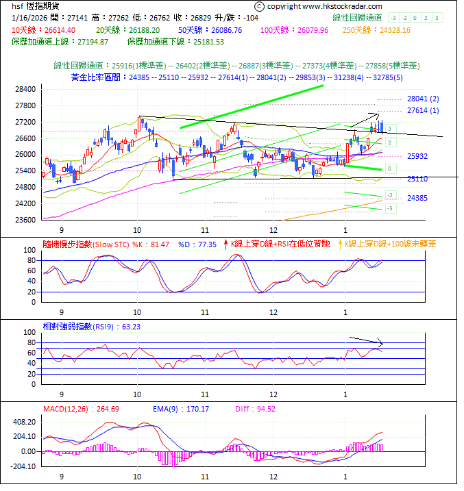 綜合以上各種分析,期指初步阻力是 27205 / 27397 / 27589 / 27781 / 27973,支持是 26754 / 26440 / 26186 / 25932 / 25620。