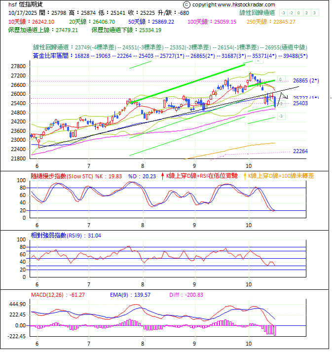 週線圖陰燭,期指終於跌穿 10週線 25878,10週線 25878 變成第一阻力,20週線 25088 是支持,週線圖好淡分界位在 25301,期指最好企穩週線圖好淡分界位 25301 之上。