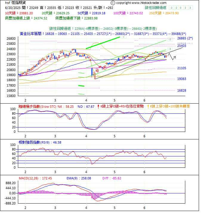 綜合以上各種分析,期指初步阻力是 23637 / 23784 / 23932 / 24113 / 24227,支持是 23383 / 23105 / 22932 / 22654 / 22376。
