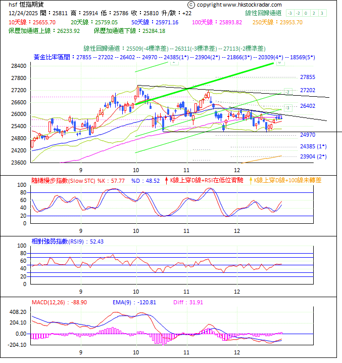 綜合以上各種分析,期指初步阻力是 26002 / 26277 / 26552 / 26891,支持是 25689 / 25518 / 25381 / 25243 / 25074 / 24967 / 24797。